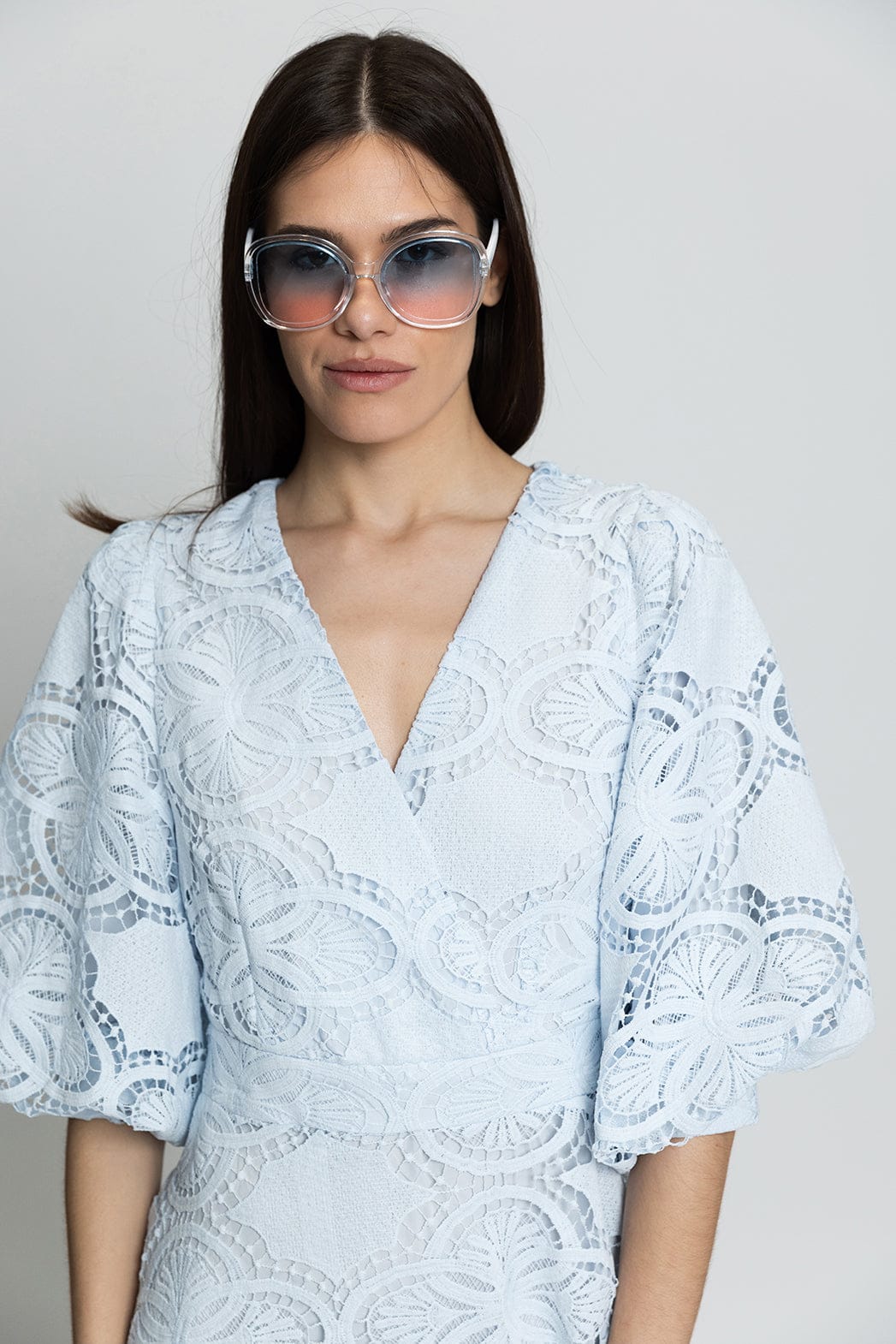 - Λαιμόκοψη V με μπροστινό κλείσιμο με κουμπιά