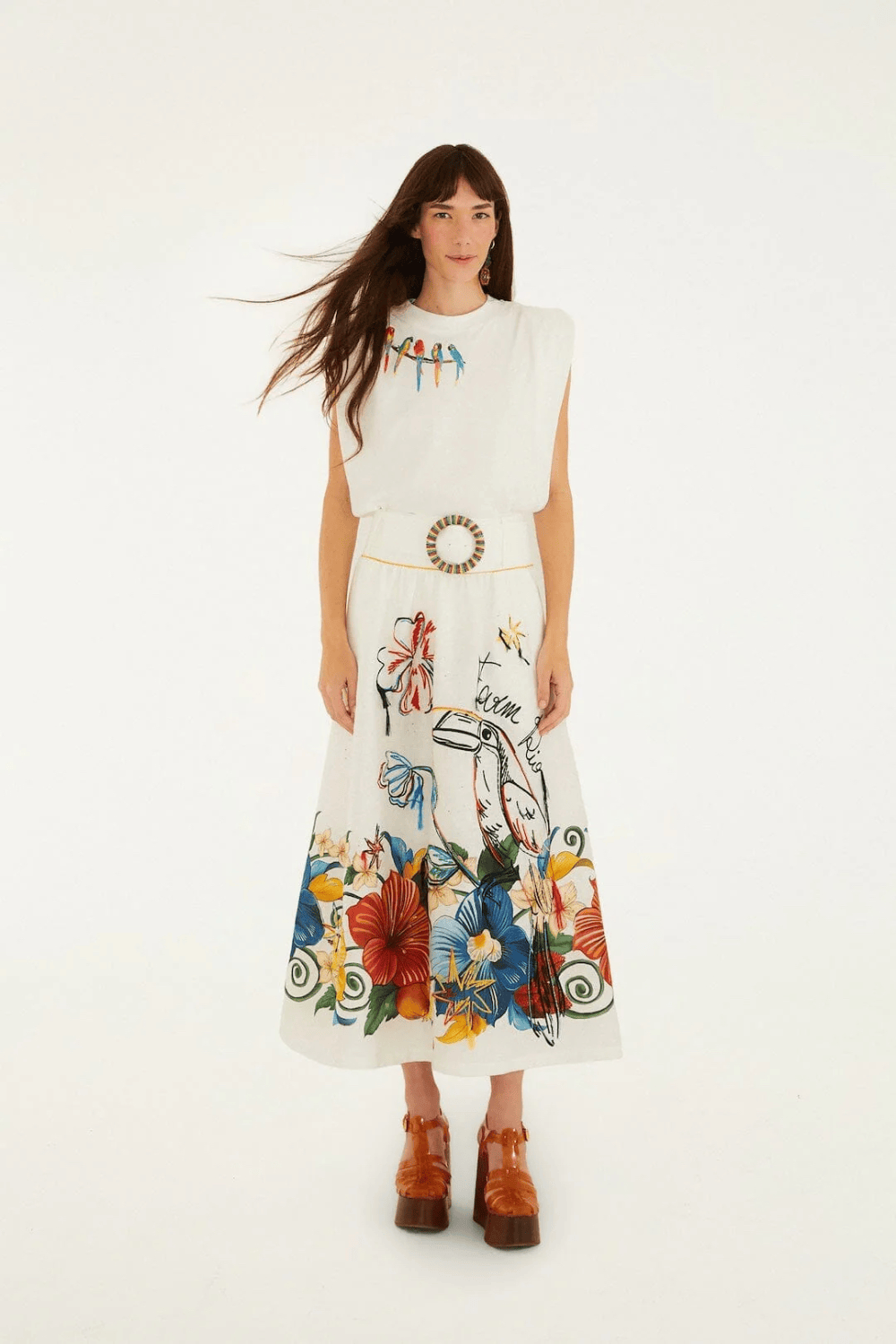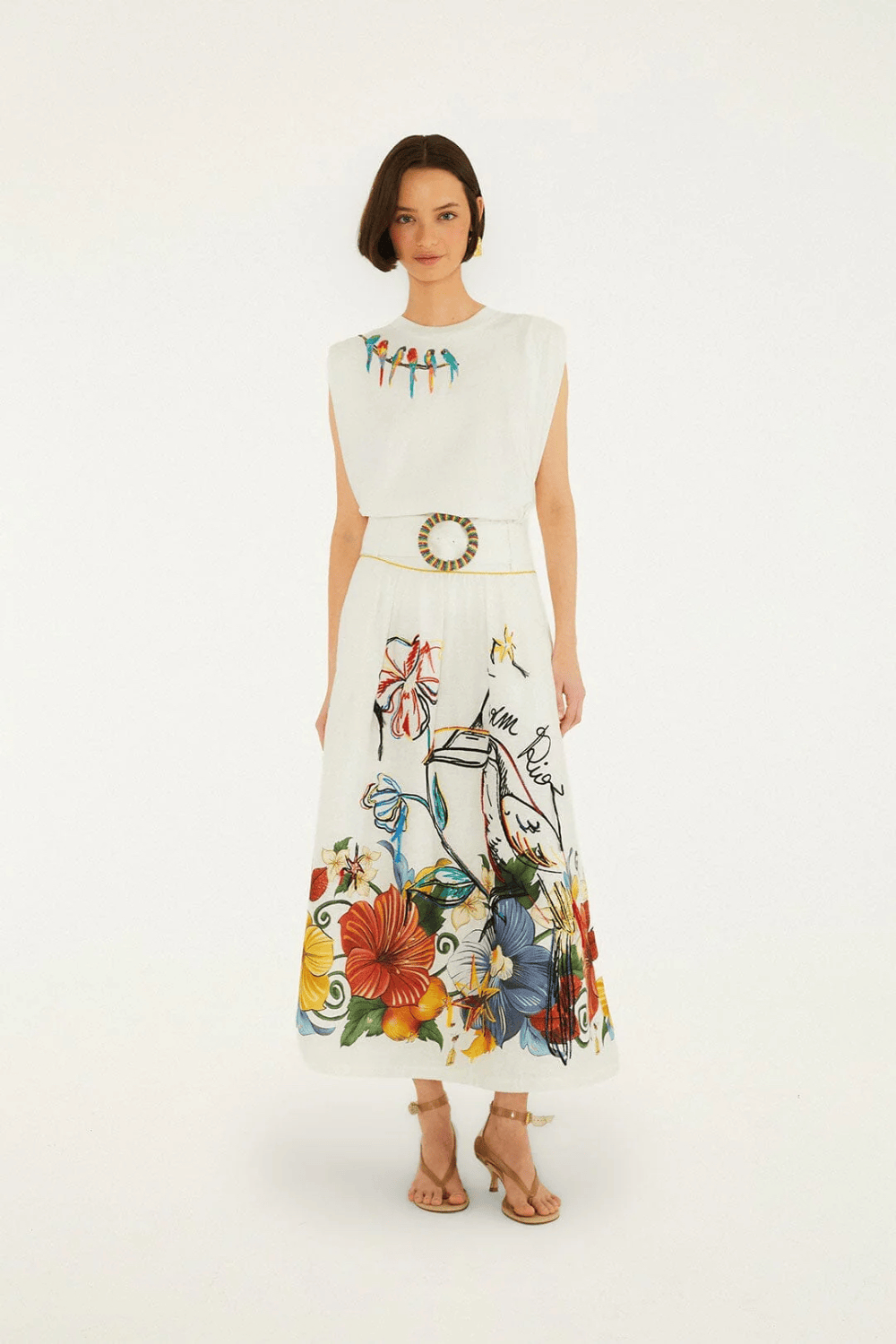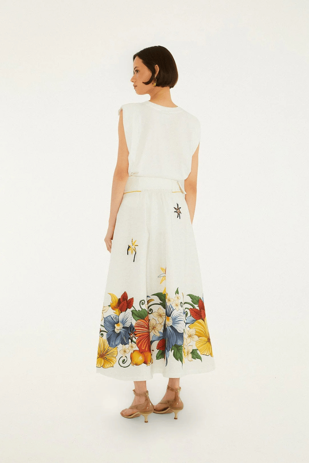 Farm Rio Tropi Embroidered Euroflax Premium Linen Midi Φούστα Άσπρη 353729