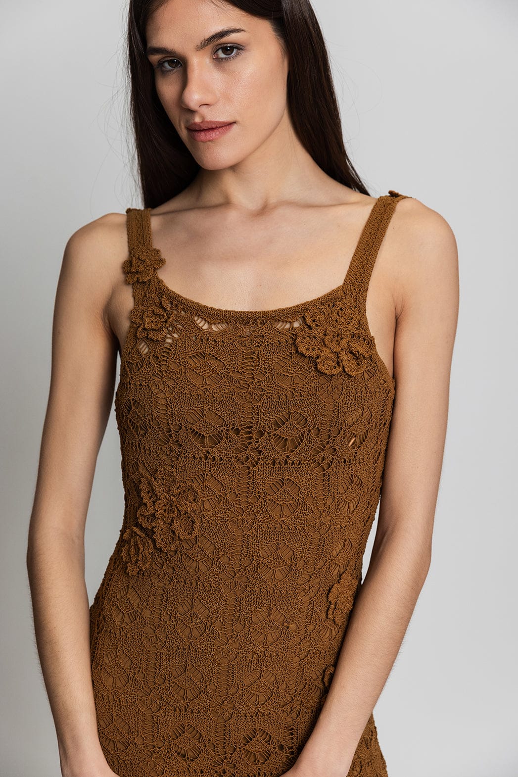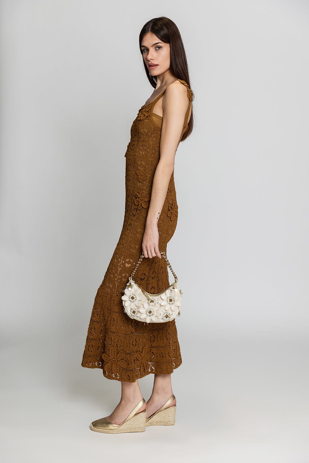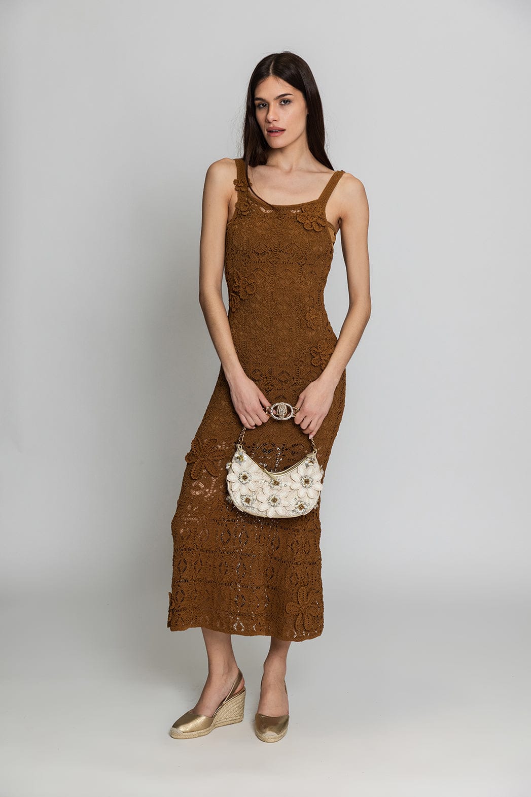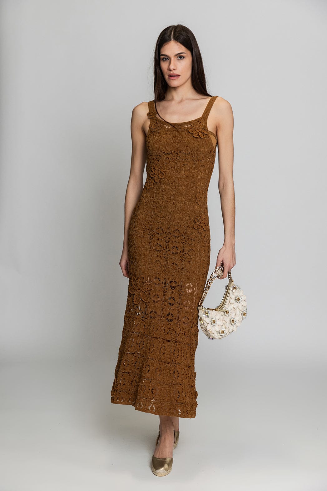 - Πλεκτό από βαμβακερό νήμα διακοσμηένα με λουλούδια διαφορετικών μεγεθών ραμμένα στο χέρι