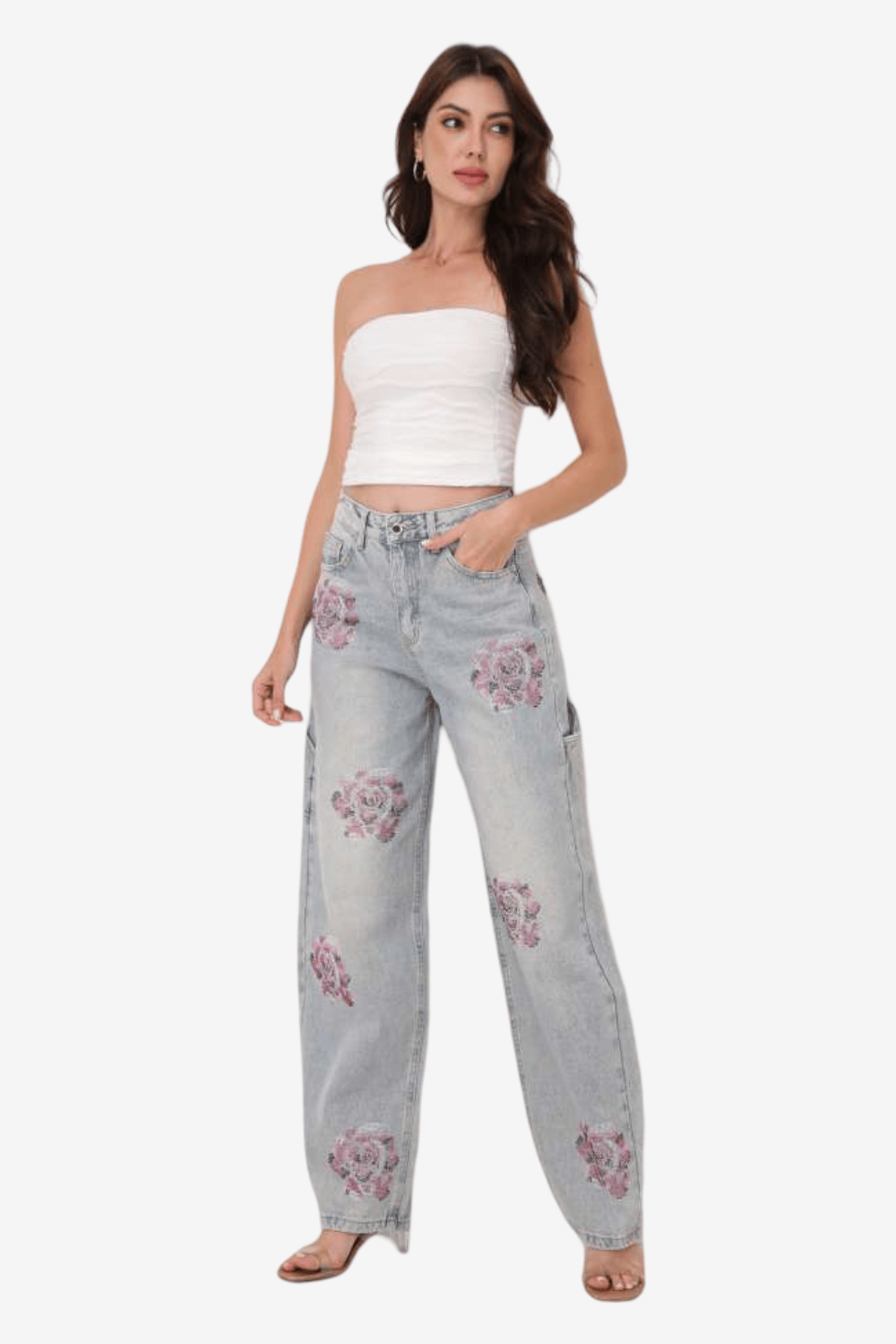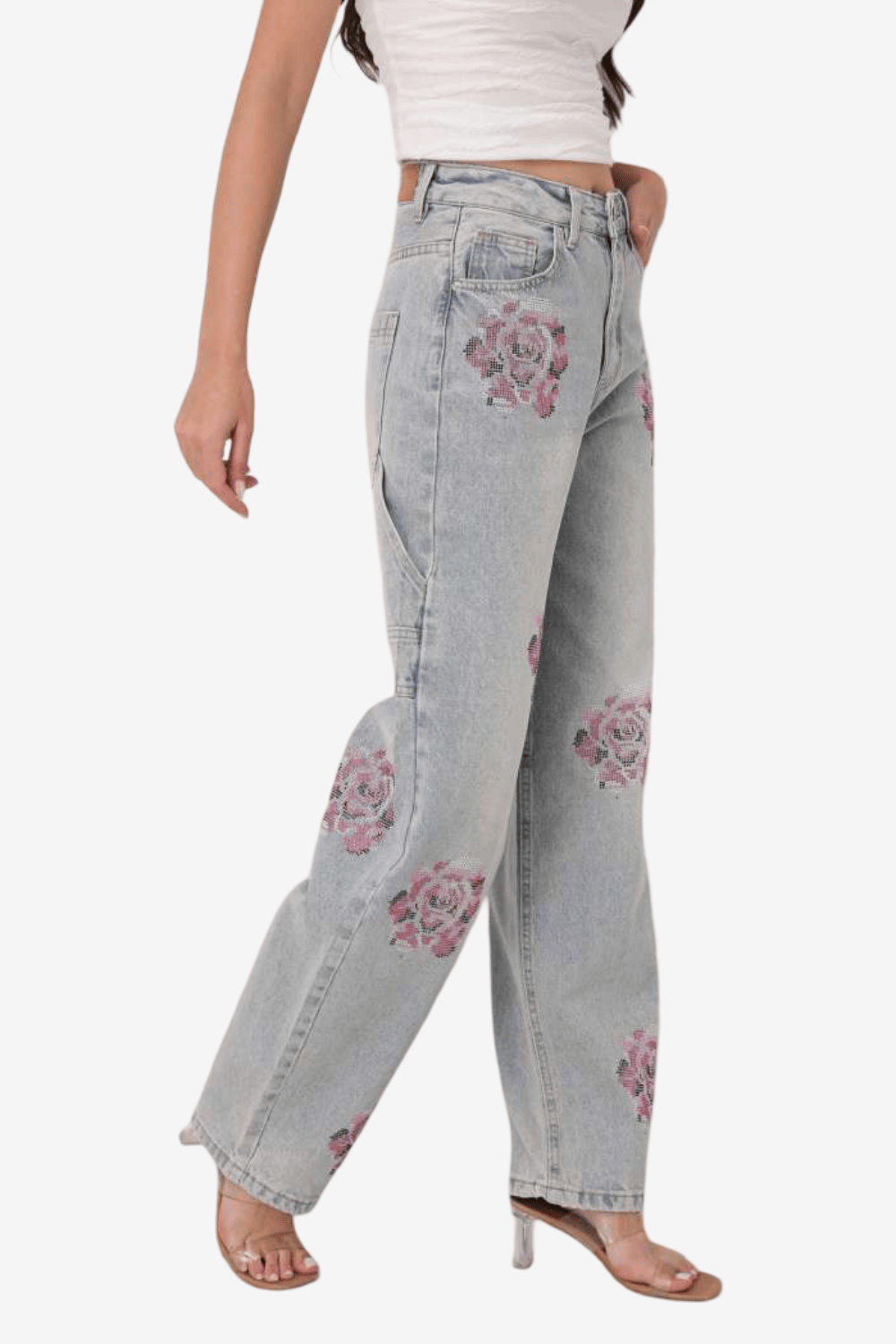 See See Παντελόνι Τζιν Floral με Strass Μπλε Ανοιχτό A3824