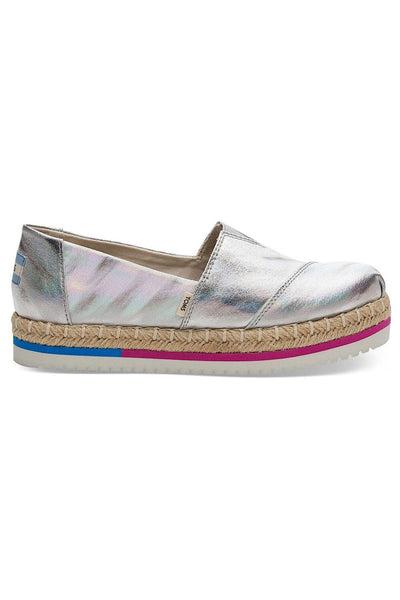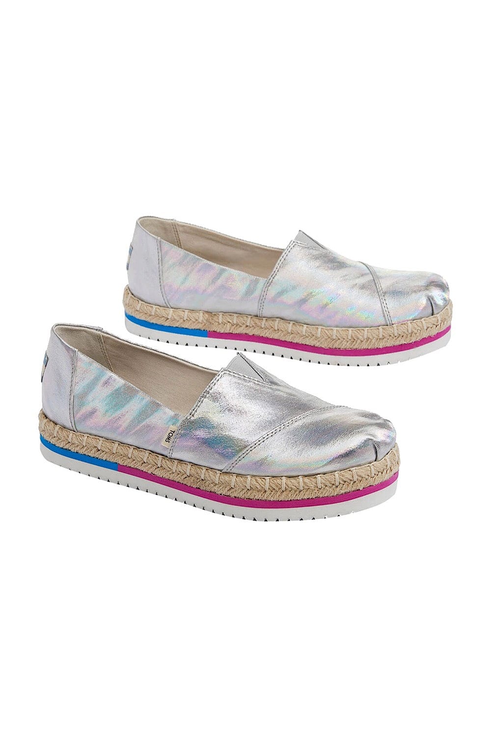 Κανονική τιμή €75,00 Εκπτωτική τιμή €37,50 έκπτωση 50%- Toms υφασμάτινες εσπαντρίγιες σε ιριδίζον ασημί χρώμα και με λεπτομέρεια φούξια και γαλάζιας οριζόντιας λωρίδας