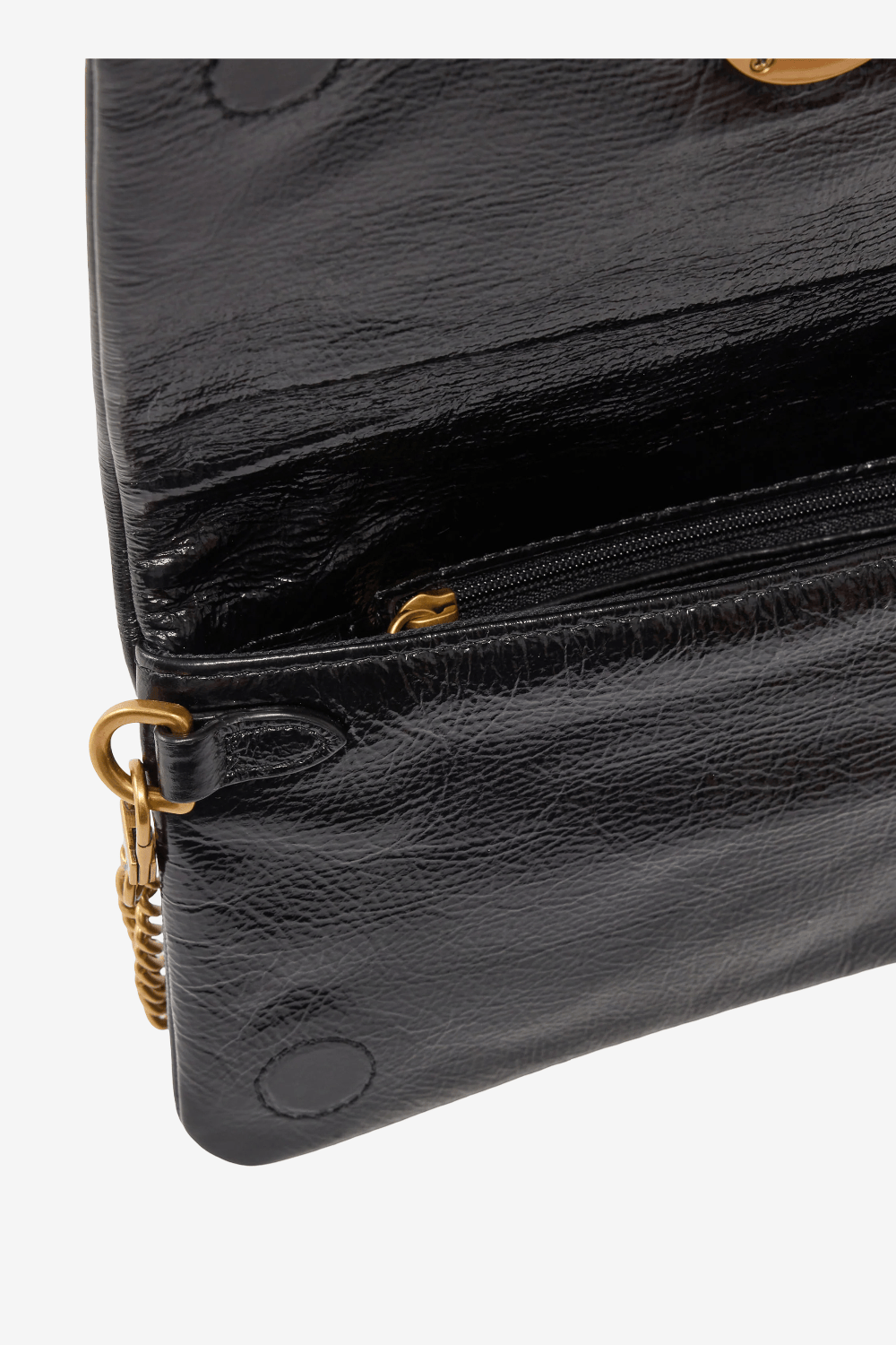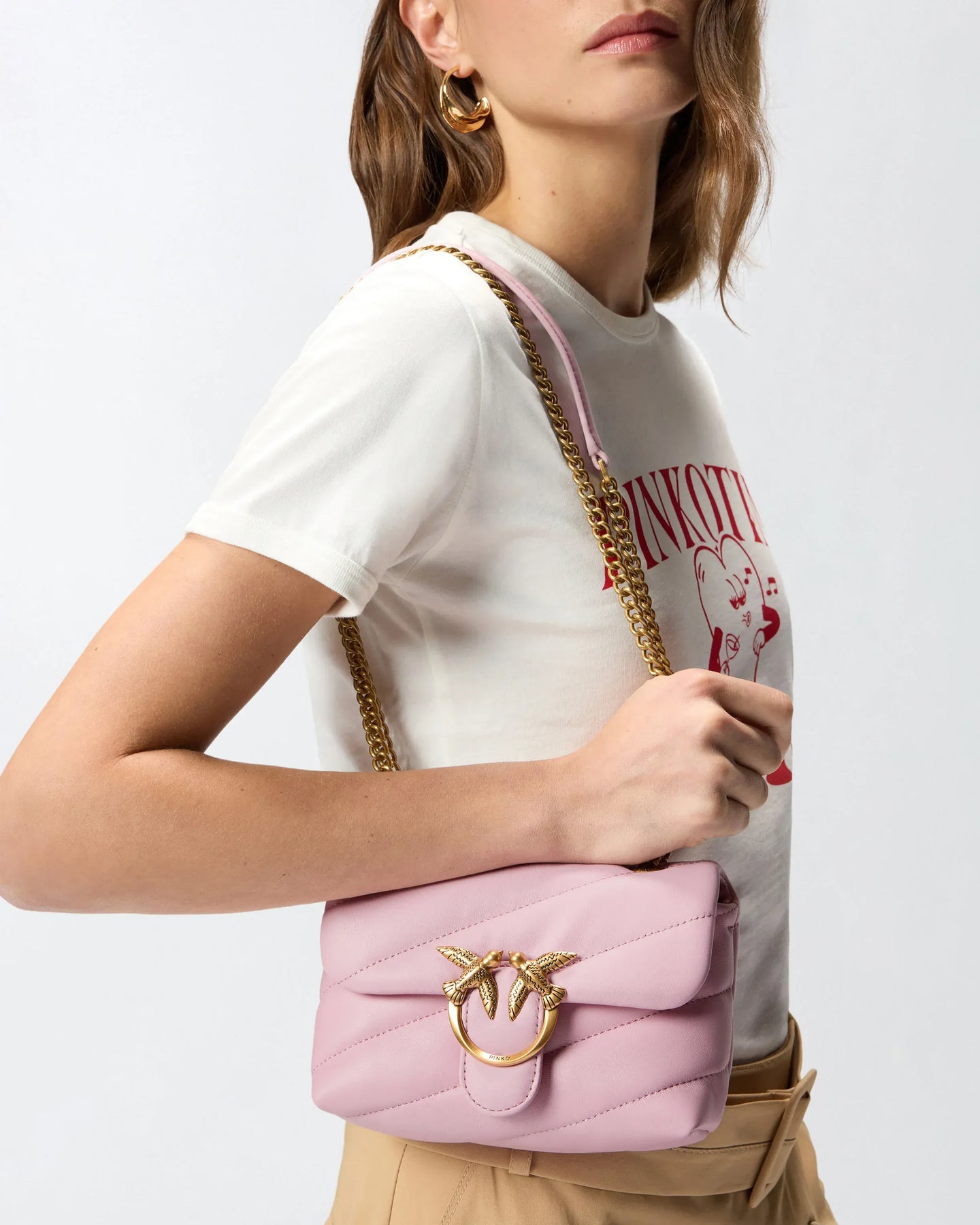 - Μικρή στρογγυλή αγκράφα με το εμβληματικό λογότυπο Love Birds και διακοσμητικούς μεταλλικούς κρίκους με γράμματα που σχηματίζουν το λογότυπο PINKO