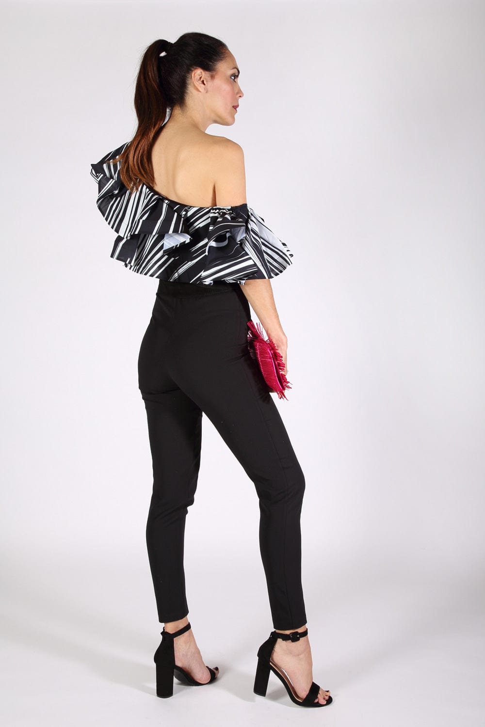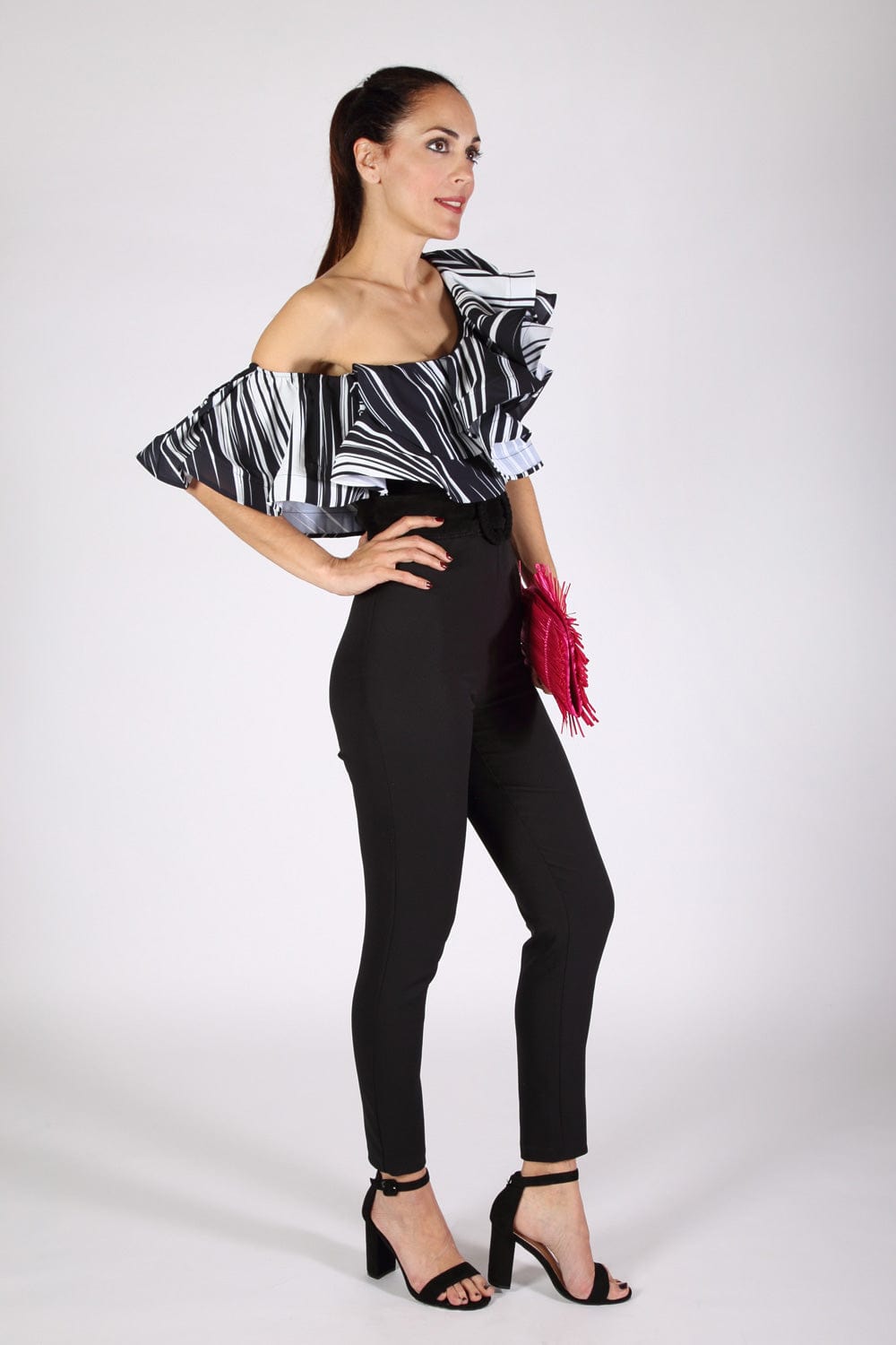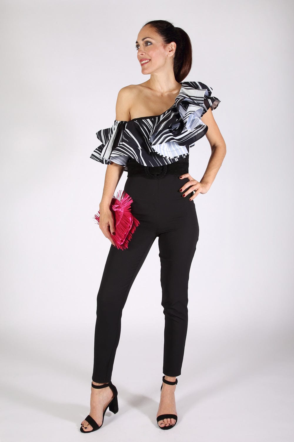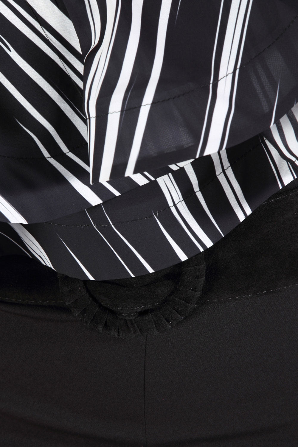 - Σχέδιο στο μπούστο και στο μανίκι που σχηματίζει βολάν σε ασπρόμαυρες αποχρώσεις