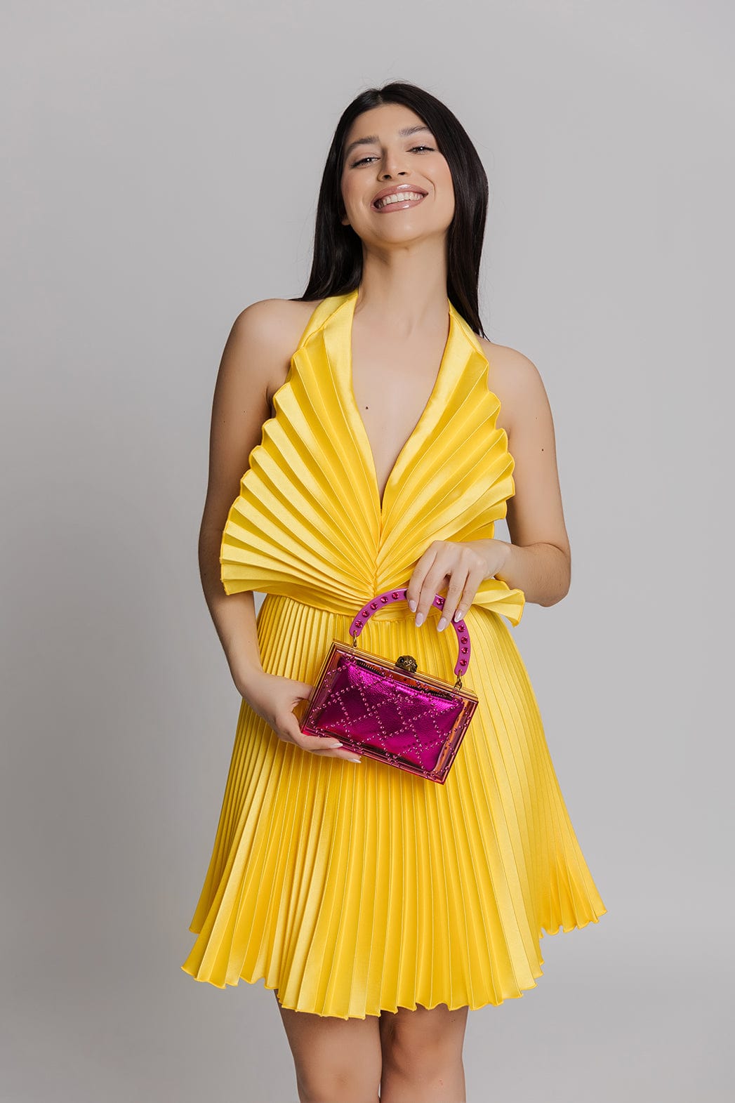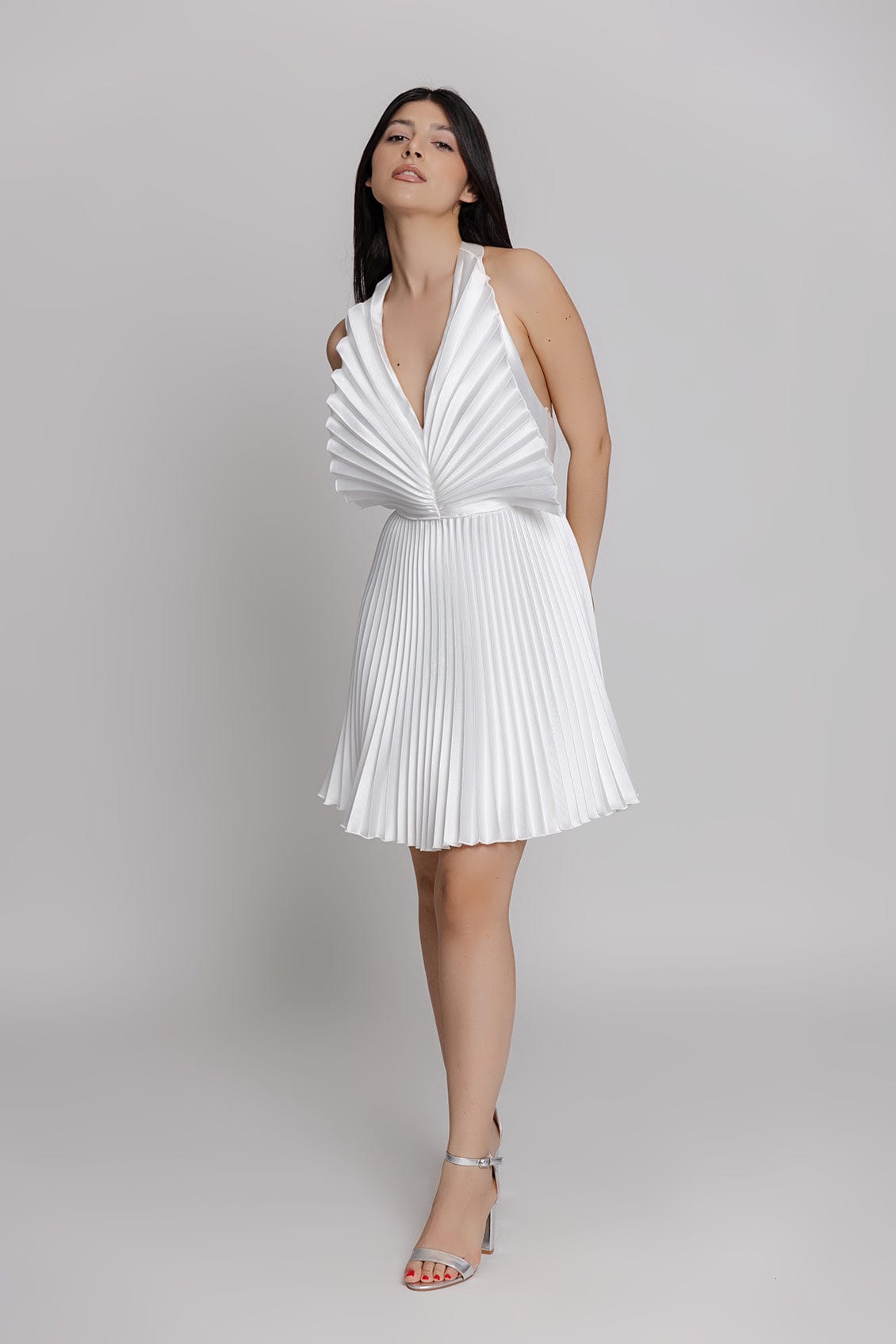 - Έντονο πλισέ σε σχήμα βεντάλιας με V λαιμόκοψη