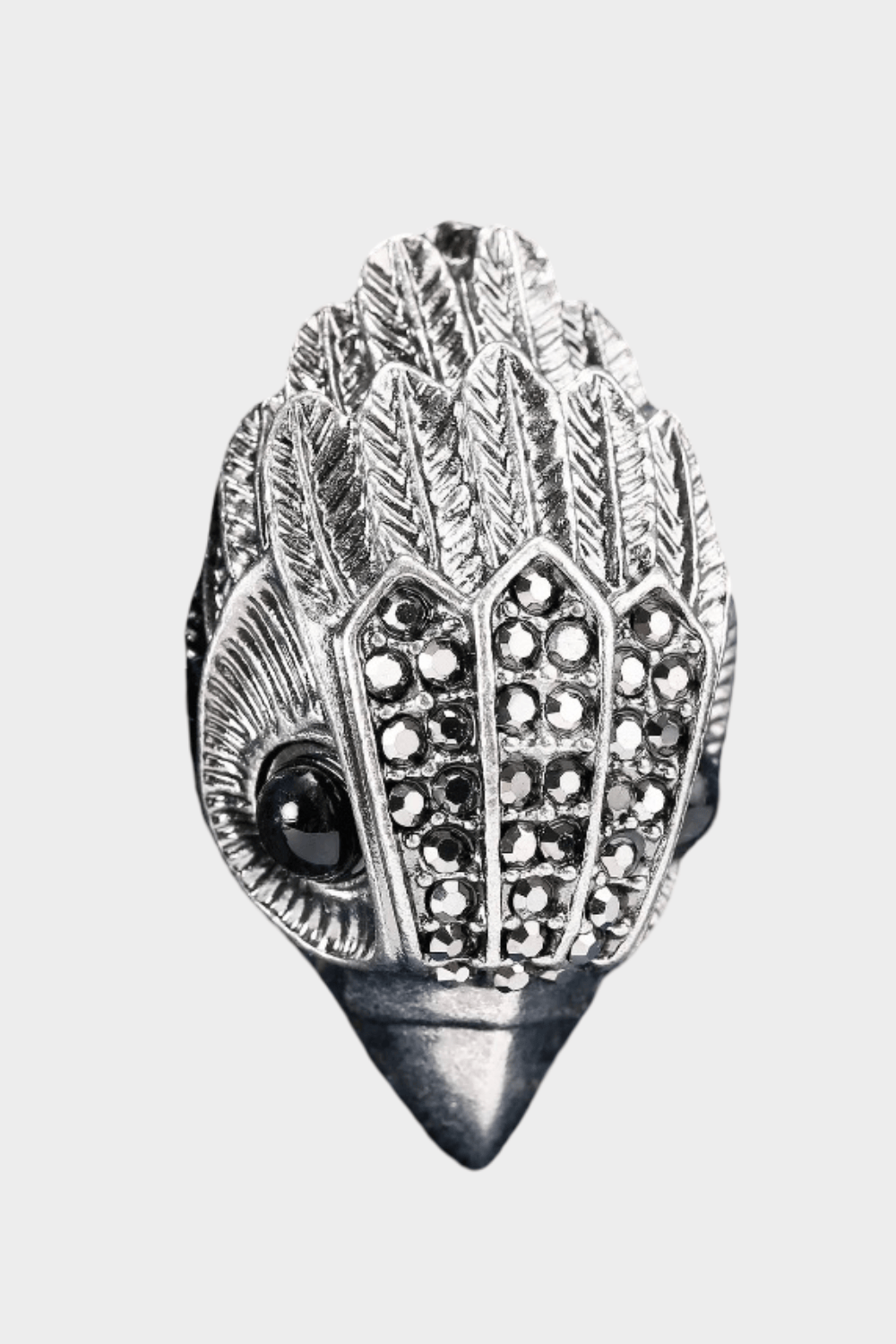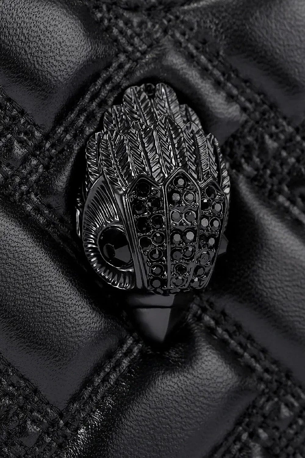Decorated with a silver eagle head with silver crystals and black beads on the front